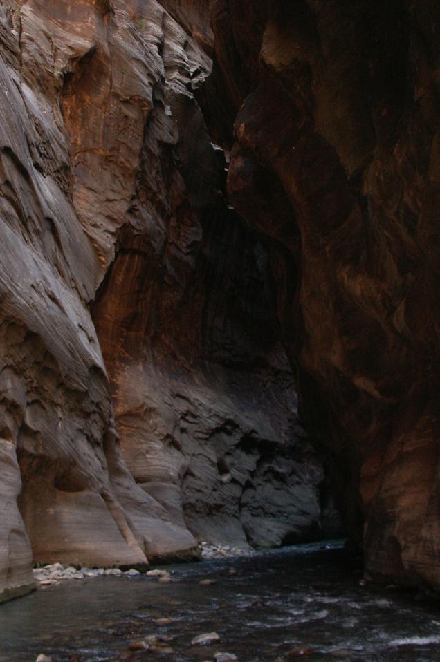 The spectacular Zion Narrows hike wades through waist deep water to reach the extremely narrow upper reaches of the canyon. You don't want to be here when it's raining upstream! (45/51)