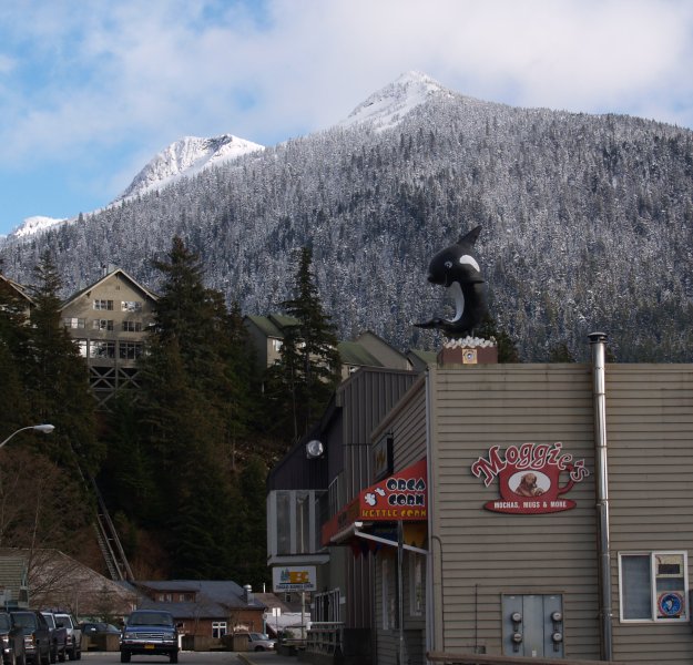 The view along Dock Street, showing the Cape Fox Hotel on the hillside and Deer Mountain in the background. (6/27)