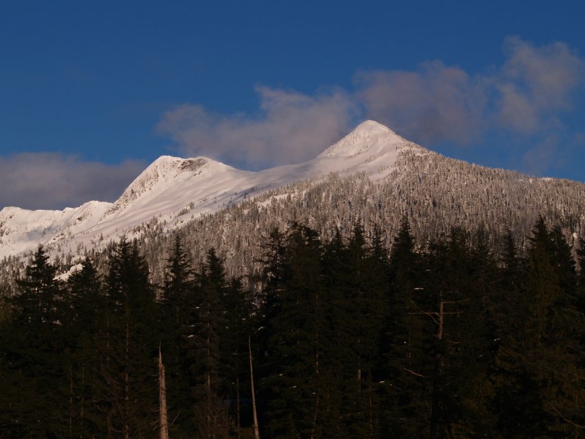 Proceeding around the curve into Bear Valley, more of the snow-covered ridgeline behind the Deer Mountain peak is seen. (4/13)