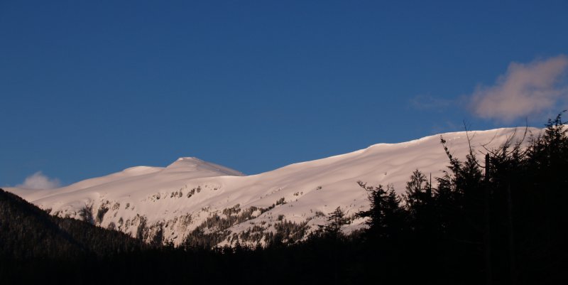 The ridge behind the peak is covered with considerably more, and deeper, snow than the front face of the mountain. (7/13)