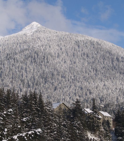 The Cape Fox Lodge sits on a ridge above downtown, while snow-covered Deer Mountain sparkles in the sunshine. (12/12)