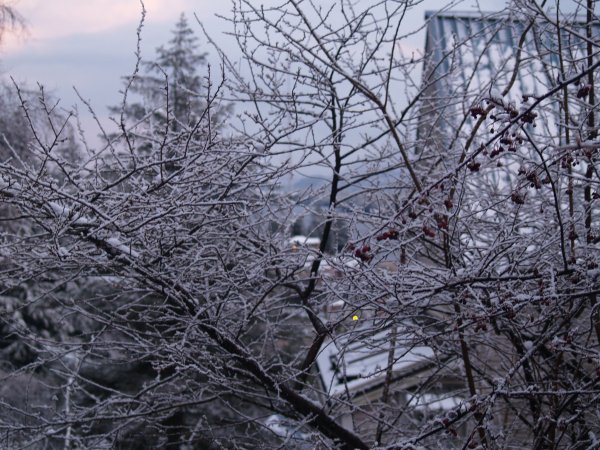 A few days ago a flock of thrushes descended in a swarm and ate the berries that were left on this tree that sitsbelow my front window and it seemed like spring was here. Today it's covered with snow. (6/12)