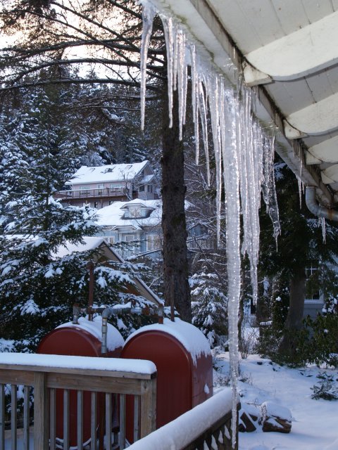 Icicles hang from my wooden gutters and snow covers nearby houses in the neighborhood. (3/12)